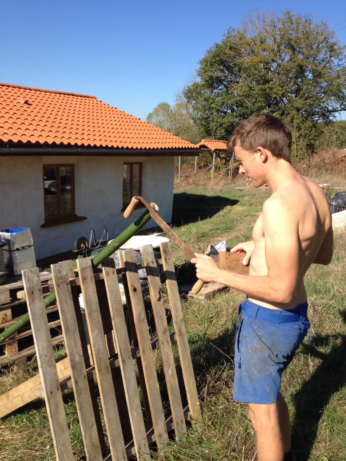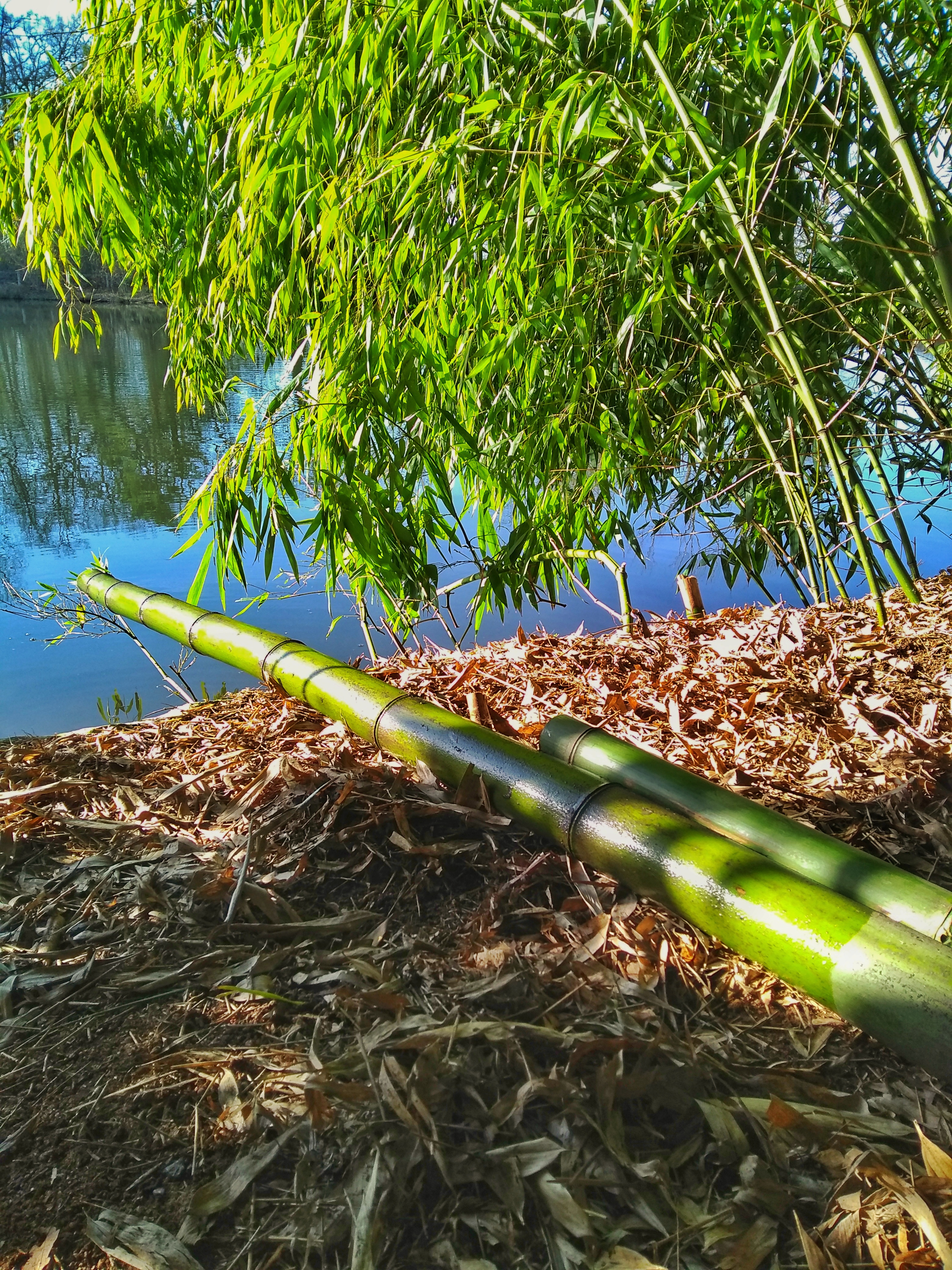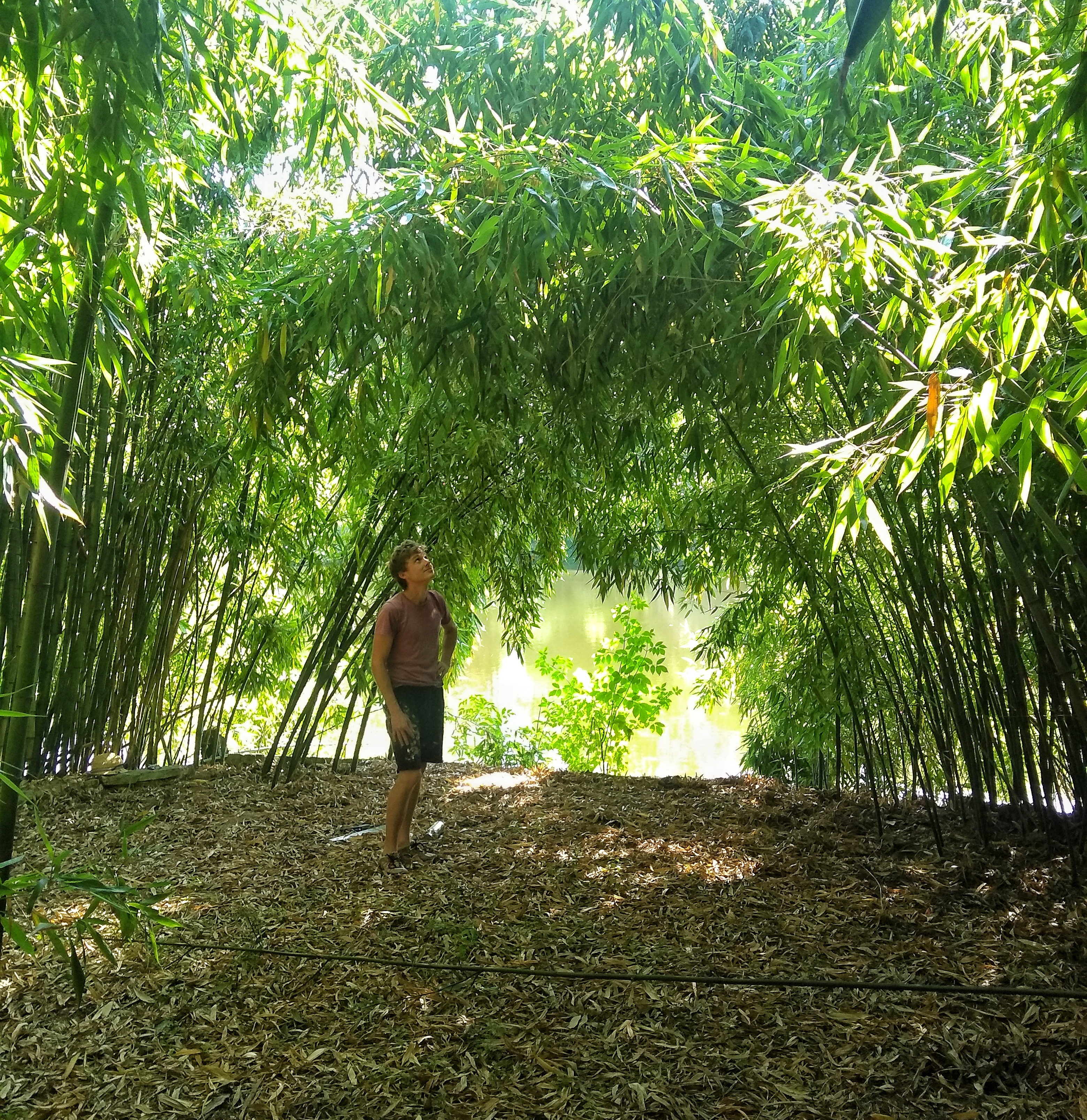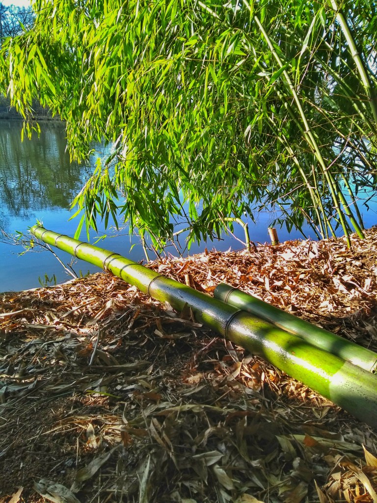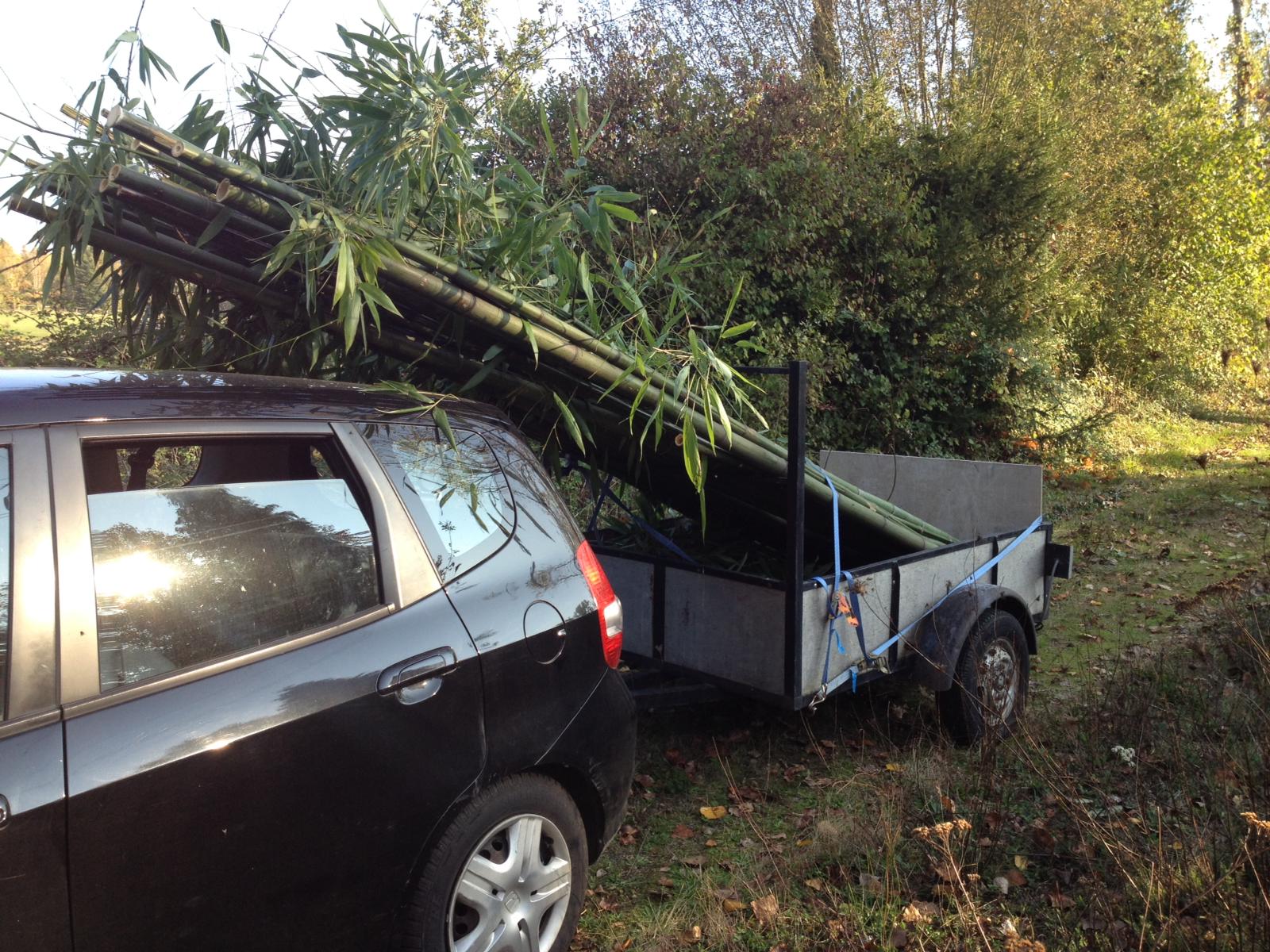 Traditionally, wattle and daub in the UK is created using a framework of woven hazel or willow – the ‘wattle’. Finding large quantities of these trees that can be cut for our purpose was surprisingly hard here in France. So we turned to the Far Eastern and tropical material, bamboo. Which happens to be one of my all time favourite plants, its durability, sustainability (growth time) and prolific nature make it an ideal choice. Where to find a bamboo forest in the south of France I hear you cry? Well, just down the road. Two generous friends of ours have a beautiful, well established bamboo forest nestled gorgeously around a lake on their grounds. They were kind enough to allow us use of their bamboo for our wattle structure and panels, and we made many trips to the bamboo forest. I love going there, it’s like teleporting to Japan.