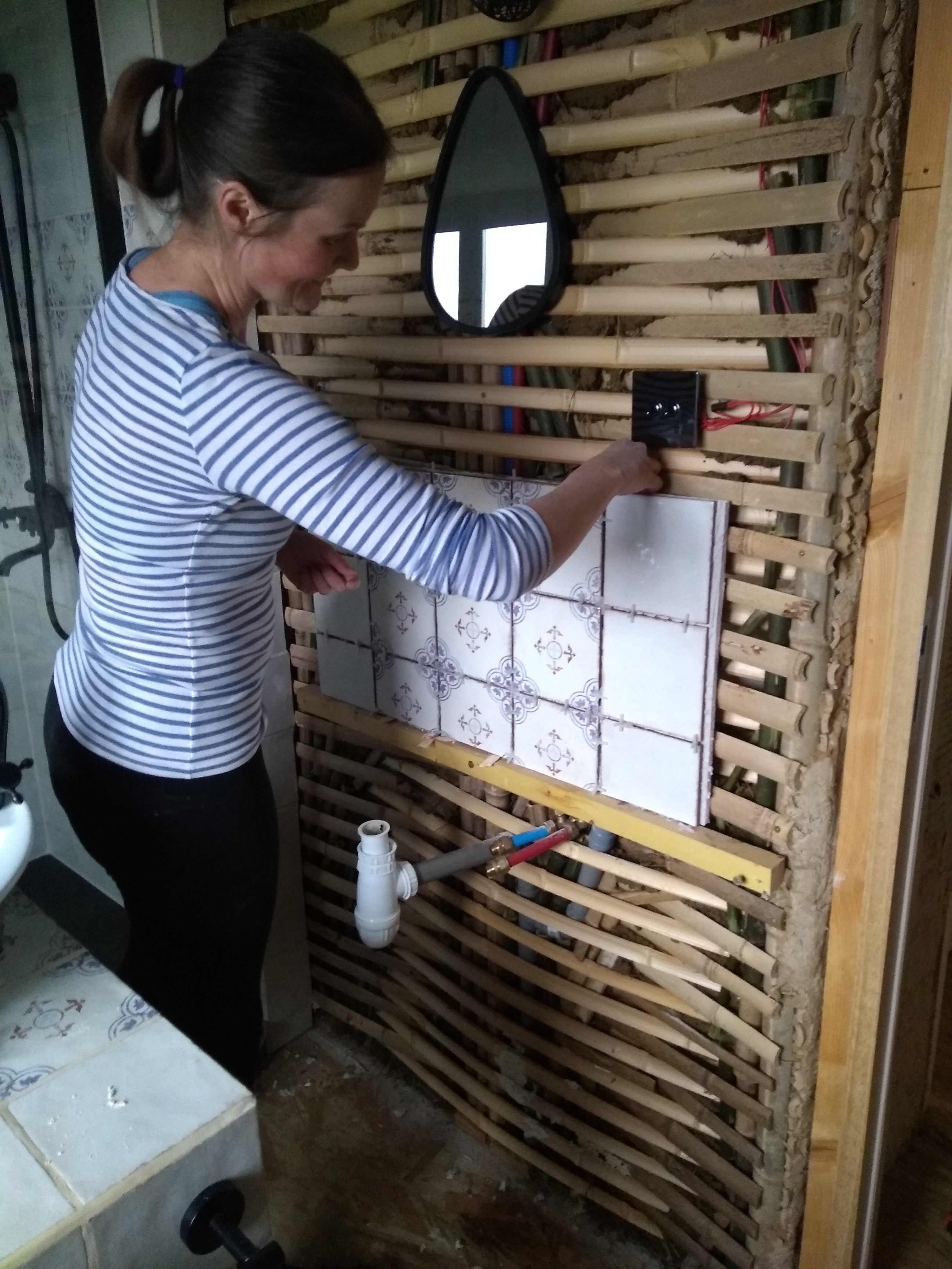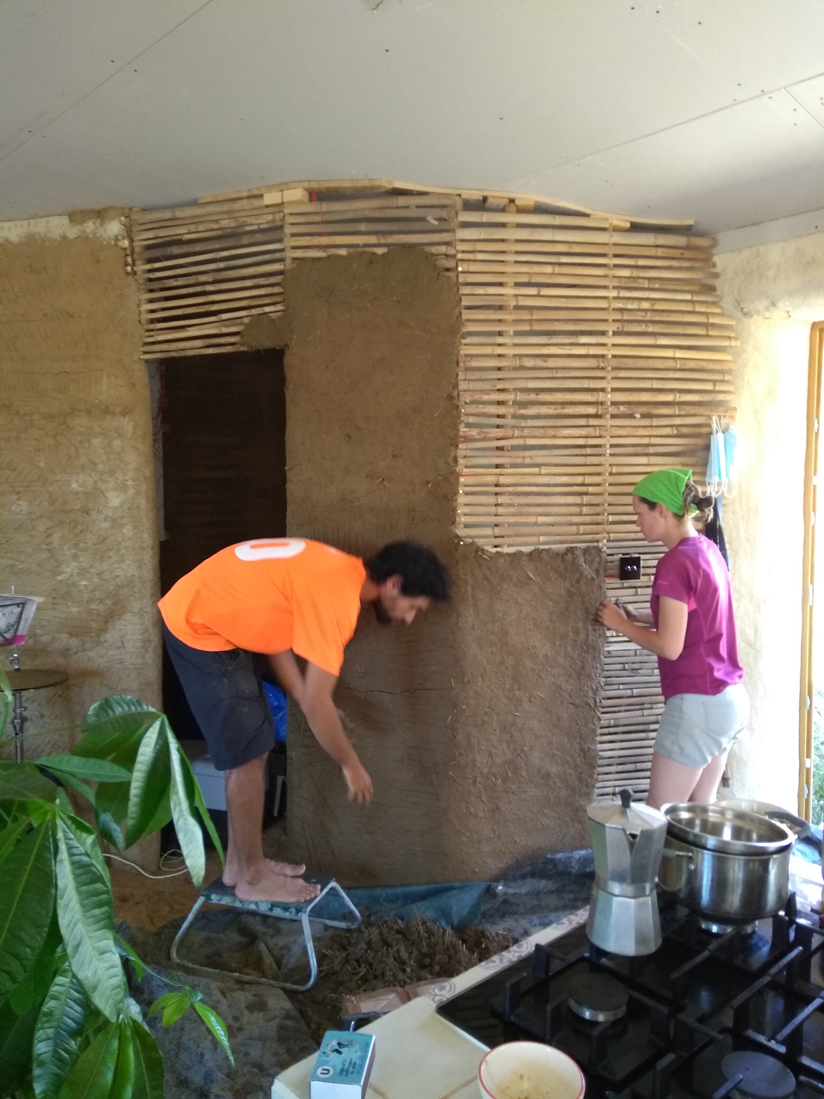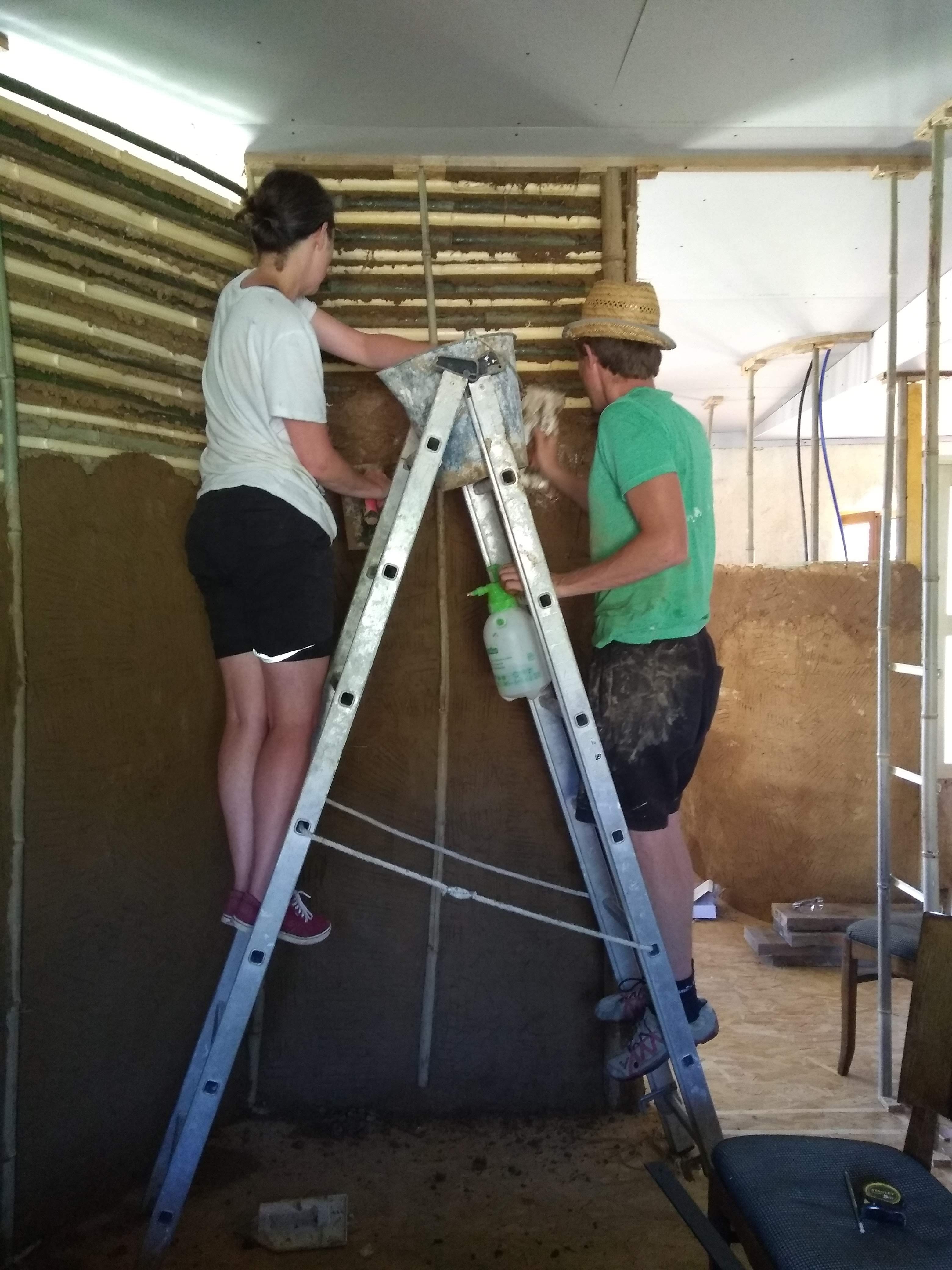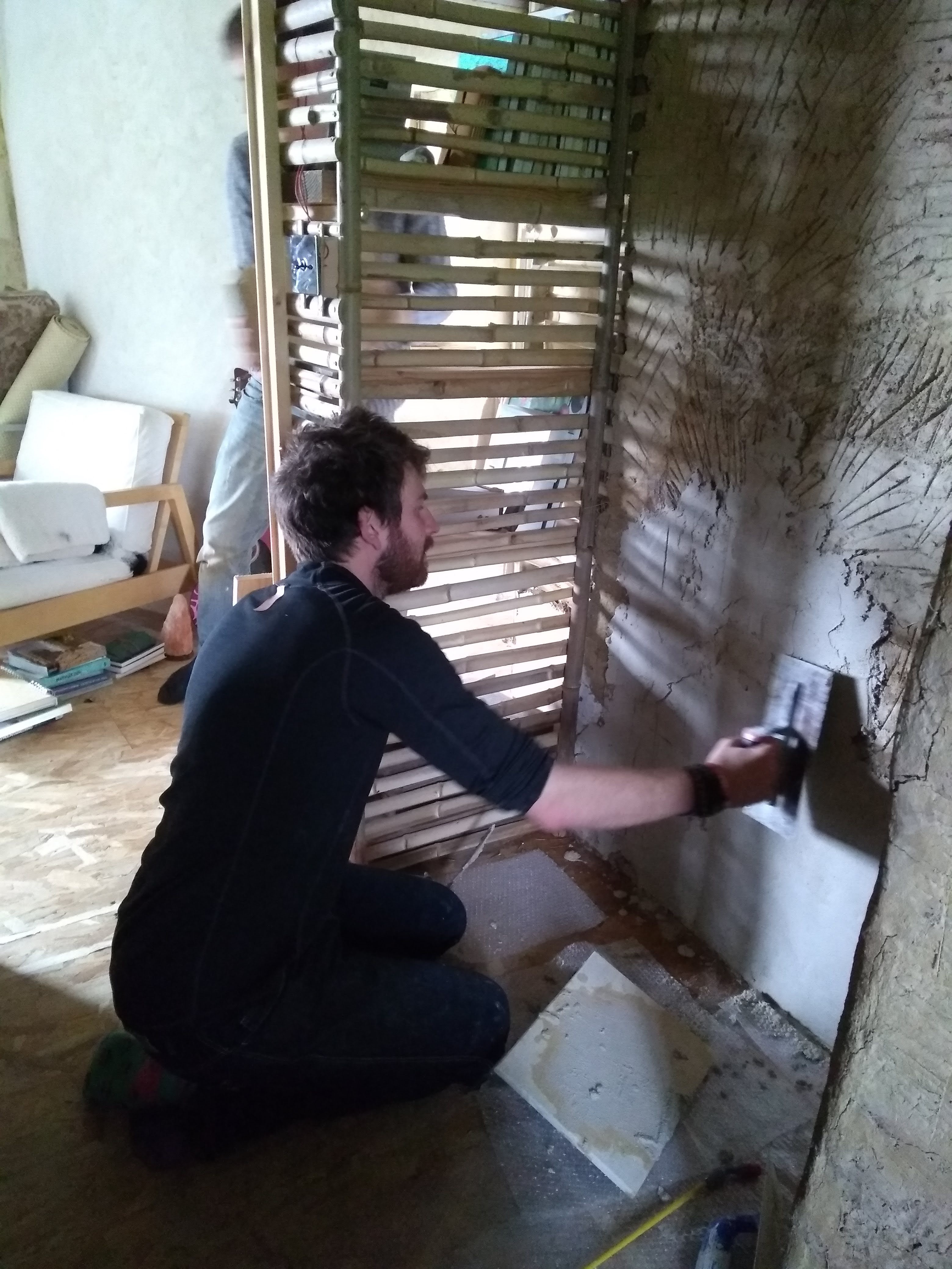 Having a lovely bucket of sloppyish brown muuuud ready to go on the wall is actually very satisfying. In some ways I prefer it to lime plastering because the materials is so forgiving and not caustic. It begs to be sculpted and is happy to oblige any random corner or strange shape gladly if there is enough reinforcing hay. It is very easy to get it smooth with a spray of water and gloves, and it is very happy to stick provided the correct spacing has been left between the bamboo struts. Too big and it collapses through, too small and it cannot connect with its buddy on the other side of the wall. It is precisely this connection around the wattle that gives it strength.
