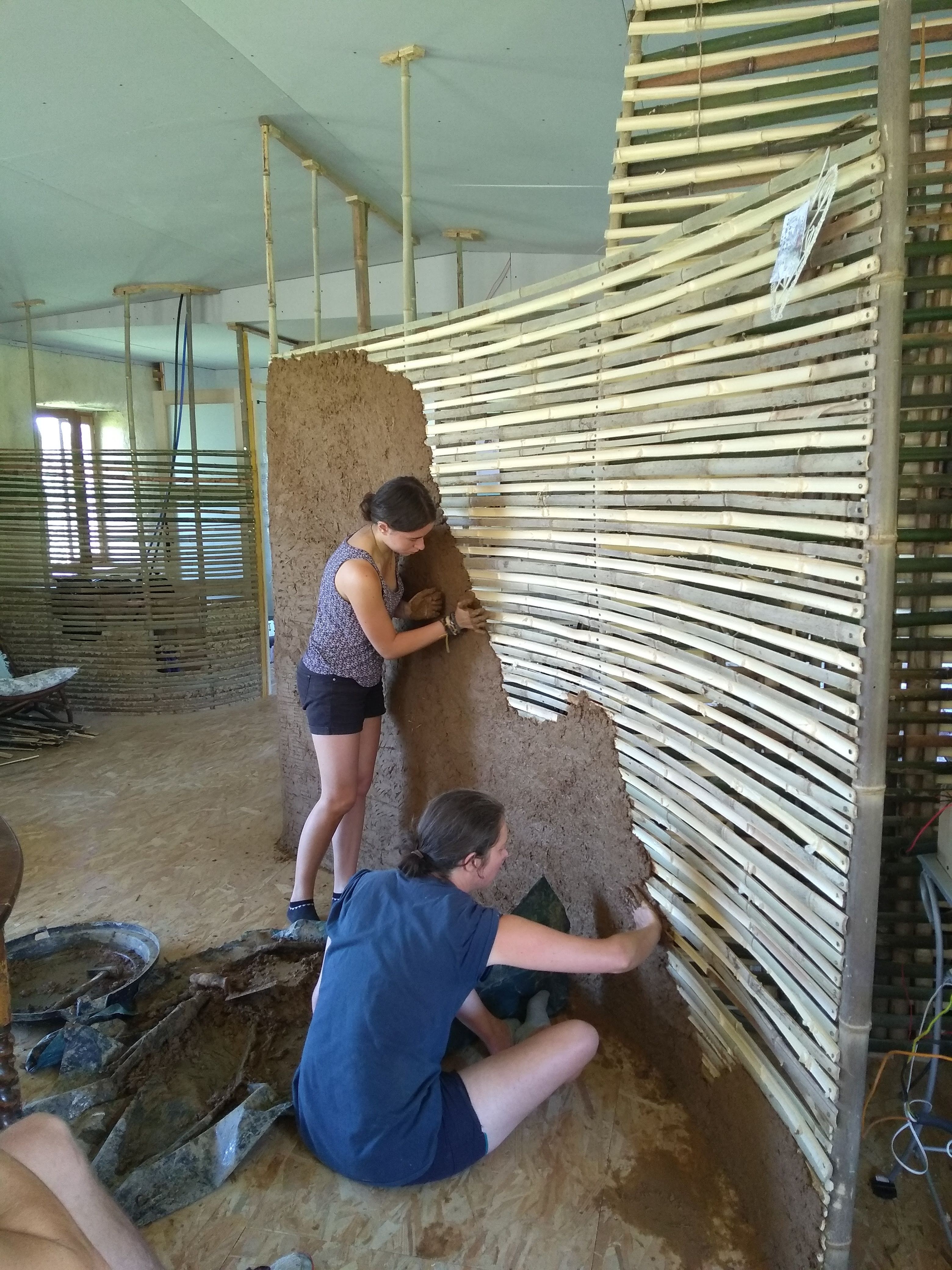 These were created by using the roof joists and the floor as fixing points and then weaving the strips of bamboo in between the upright posts. After creating a few walls in this way, we switched to the ‘panel’ technique, whereby a frame is made of bamboo and a single strut is fixed across. Although this method is more time consuming initially, our reasons for this are twofold: firstly the wall is much straighter, but secondly and most importantly it uses far less daub than the woven wall, which creates rather spacious cavities as it goes around each post. This saves times, effort and weight on the floor.