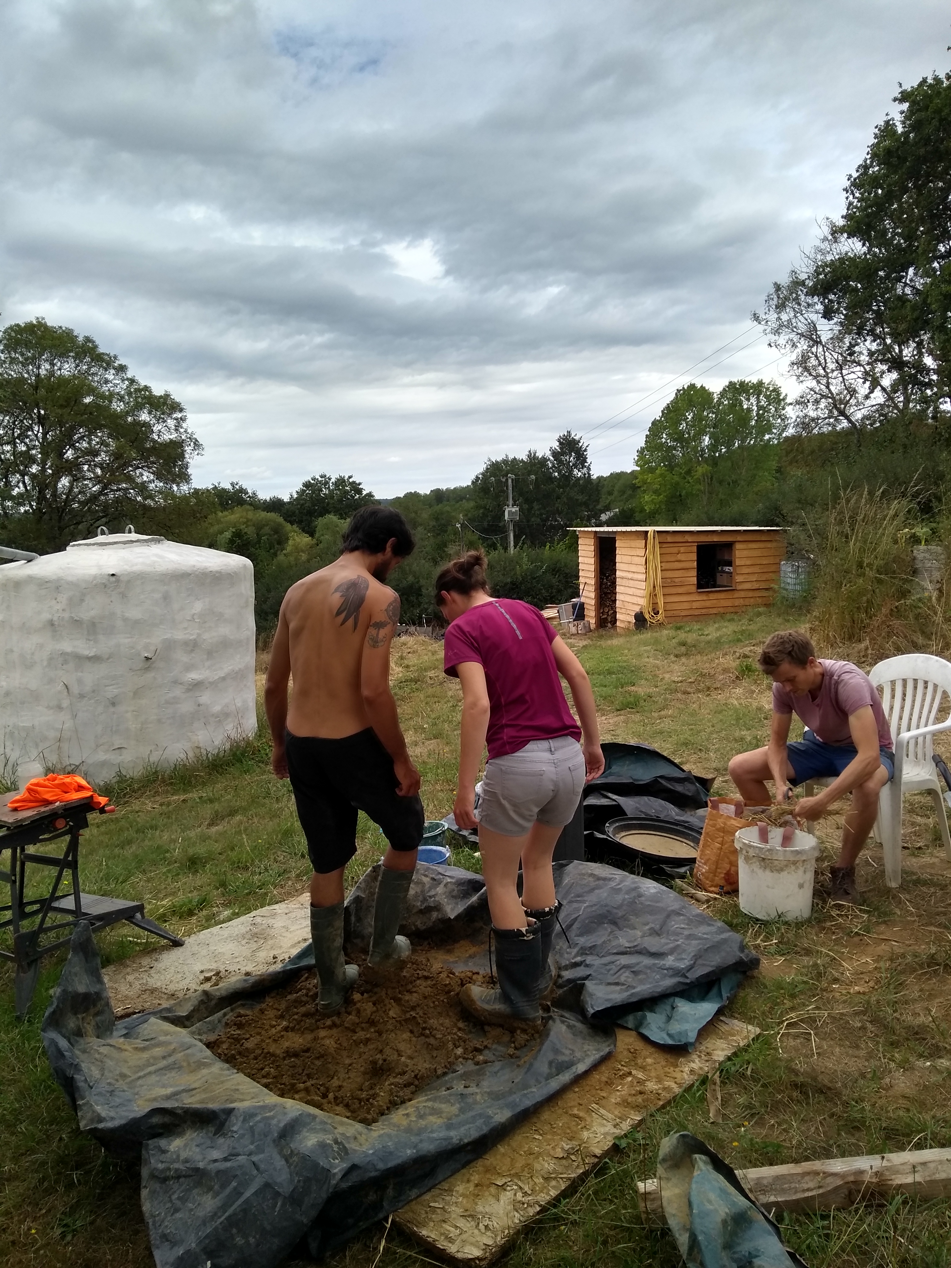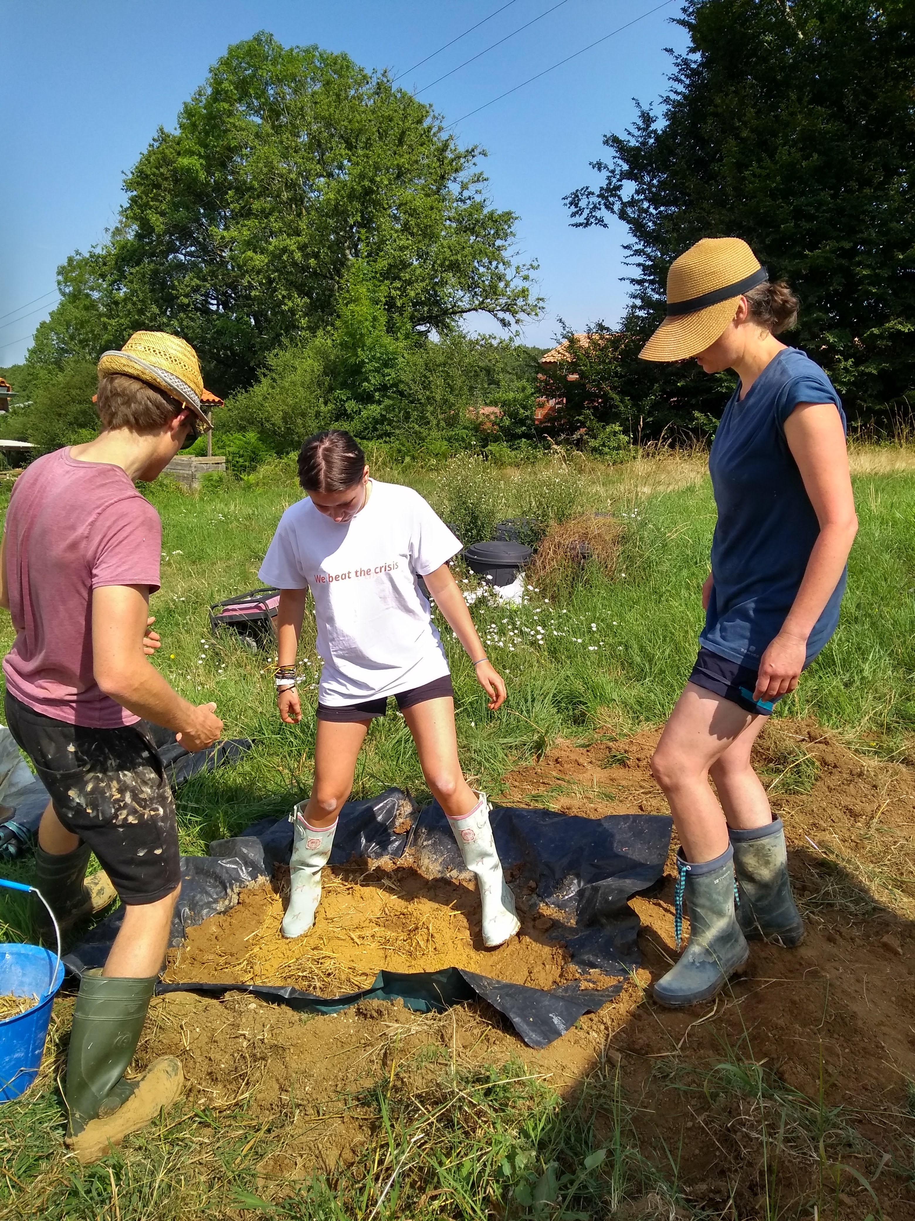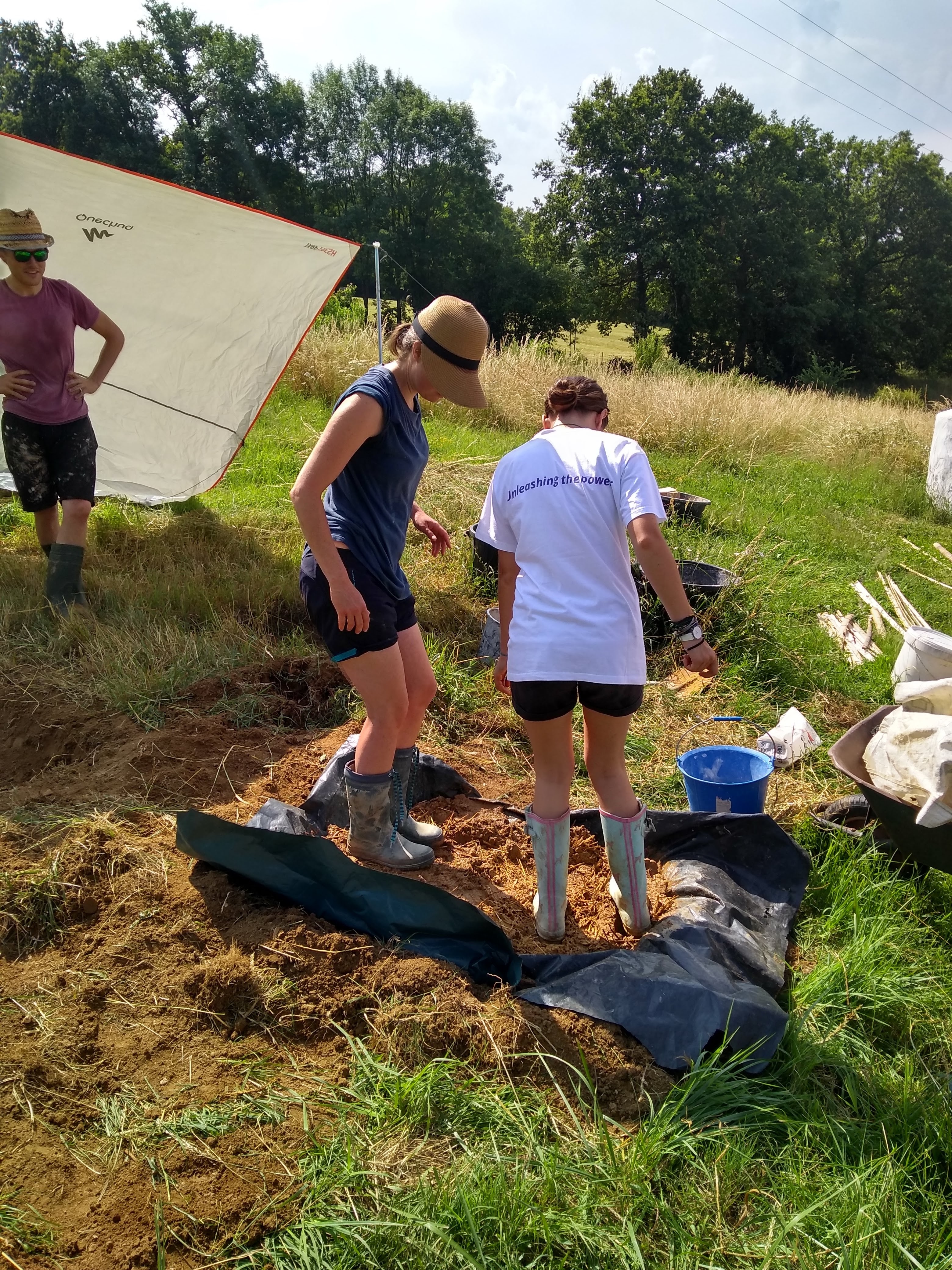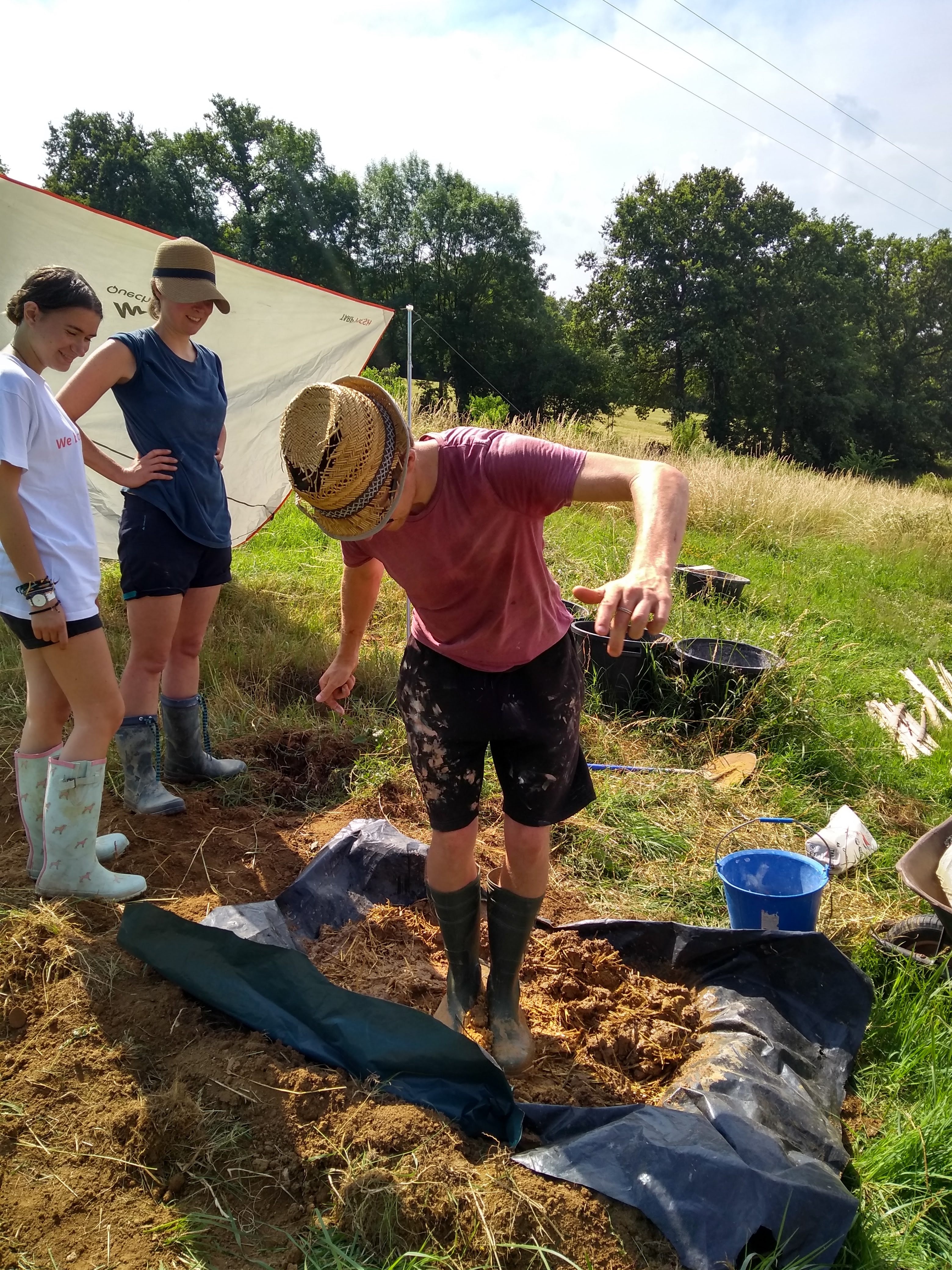 The ‘daub’ is more of a delicate art. There are some differences in the make up of this sludgy mixture, but essentially it needs three things; a binder, an aggregate and reinforcement. In our case we used clay as the binder but lime can also be used, mooshed together with sand and reinforced with straw and hay depending on what we had available on the day. Famously, manure is often added to the daub. The jury is out over whether animal dung is actually needed, it seems it is more likely that long ago straw being used as a reinforcement was recycled once it had been used for animal bedding, followed by the animals themselves often utilised to do the exhausting job of stamping the component part together. We didn’t use it! 💩 Instead opting for the many helping feet we had along this daubing journey.