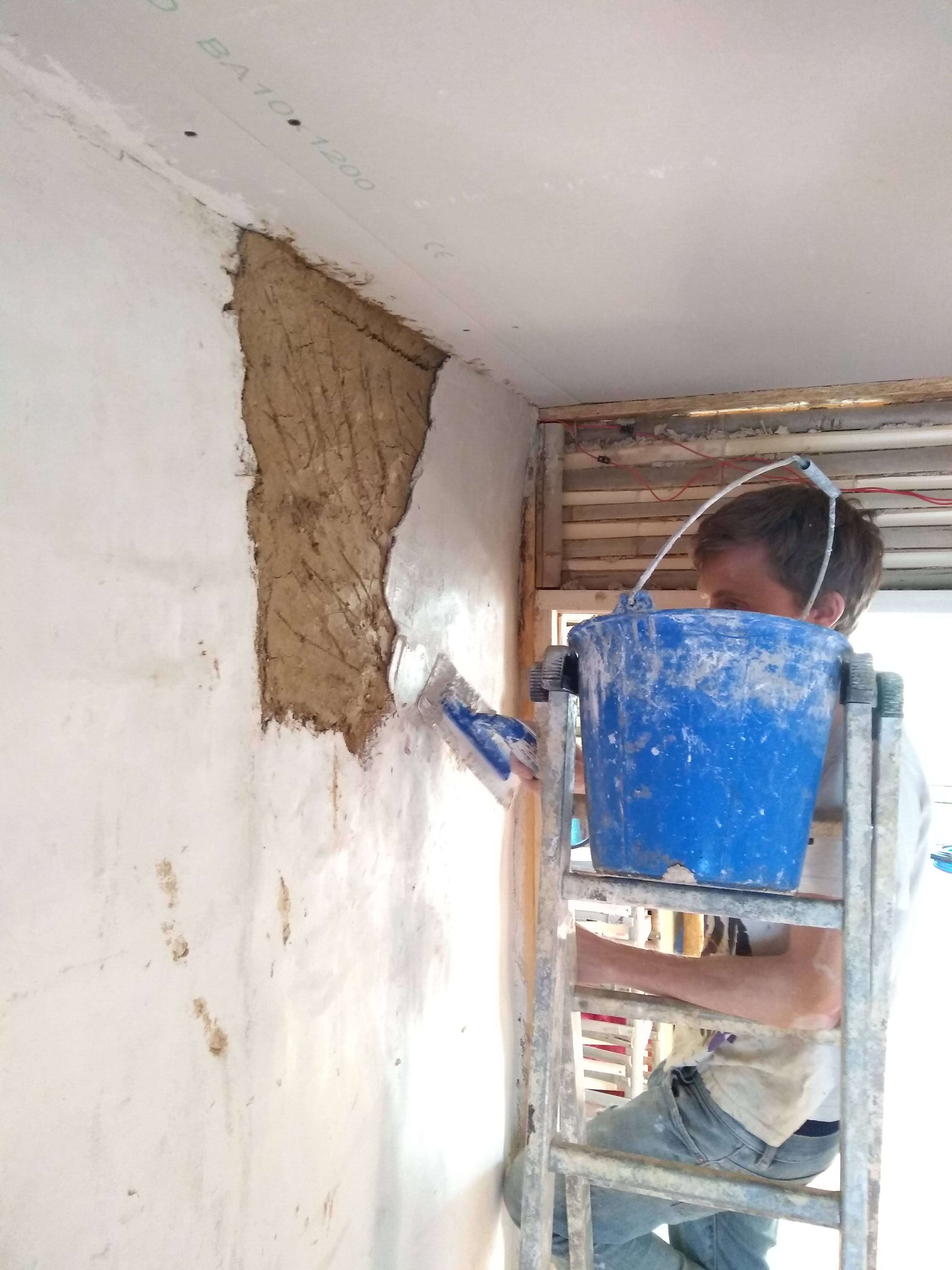 Once the wattle has been daubed on both sides, either simultaneously or at different times, and has dried out well, the final coat of lime plaster can be applied. We chose to do this to have the walls in keeping with the rest of the house. Finishing the walls with lime is also just a normal part of wattle and daubing. The lime is very good at controlling moisture and bug bugs. This has meant a huge amount of lime plastering for Dan and I, and with no mixer, we beat all the lime putty by hand. If the internet ever goes down I think I could still make a living as a lime beater, I would definitely be as stacked as Arnie if it were my full time job! Lime plastering is a highly physical job, but we feel like we’ve finally got it down, right as we near the end of the process of course. We did have helping hands for one section of the wall and it is again, a lovely element to share. However it can be tiring and it is quite unforgiving, it certainly takes a knack to apply it anywhere near to perfect.