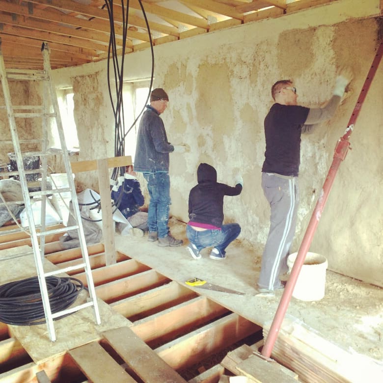 Family labour helping with the body coat of internal plaster